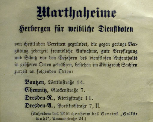 Damals diente das Eckhaus Nieritz-/Theresienstraße als schlichte Herberge für ledige junge Frauen vom Lande, die zumeist am Schlesischen, dem späteren Neustädter Bahnhof, ankamen. Die meisten dieser Frauen reisten in der Hoffnung nach Dresden, hier eine Arbeit zu finden. Im Marthaheim fanden Sie günstig Kost und Logis, zugleich aber auch Schutz in der für sie ungewohnten Großstadt.